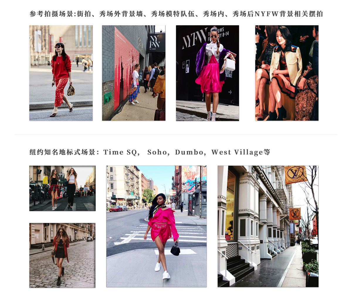 · 纽约时装周街拍、秀场外背景墙、秀场模特队伍、秀场内、秀场后NYFW背景等摆拍