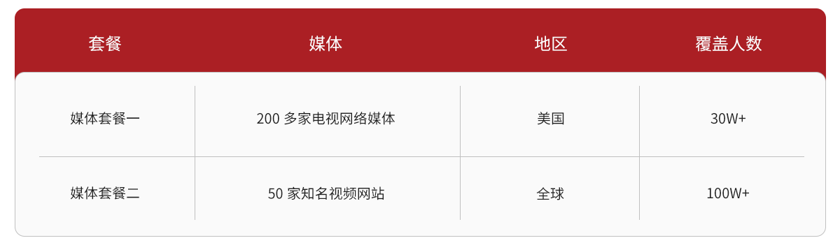 (1)媒体套餐一:美国200多家电视网络媒体视频播展,覆盖人群30万+。