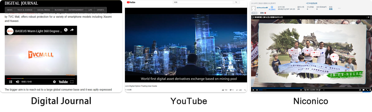 网络媒体视频展播及YouTube、Niconico知名视频网站发布案例展示,还有其余全球50家视频知名媒体同步发布,覆盖观看人群达100万+。