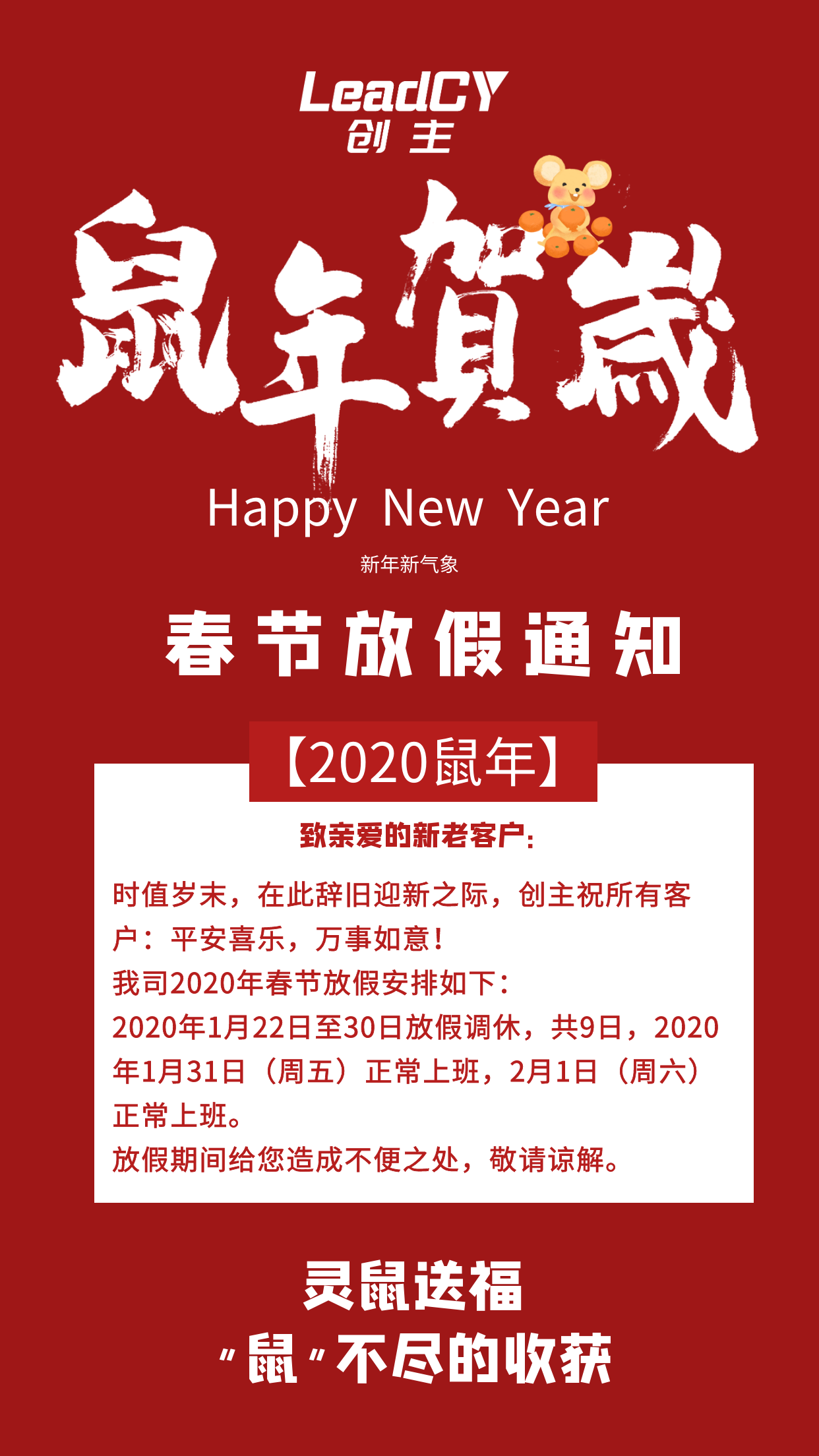 创主2020年春节放假通知