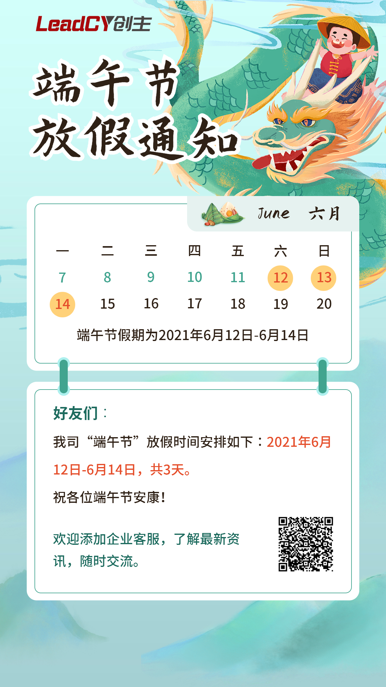 创主2021年端午节放假通知