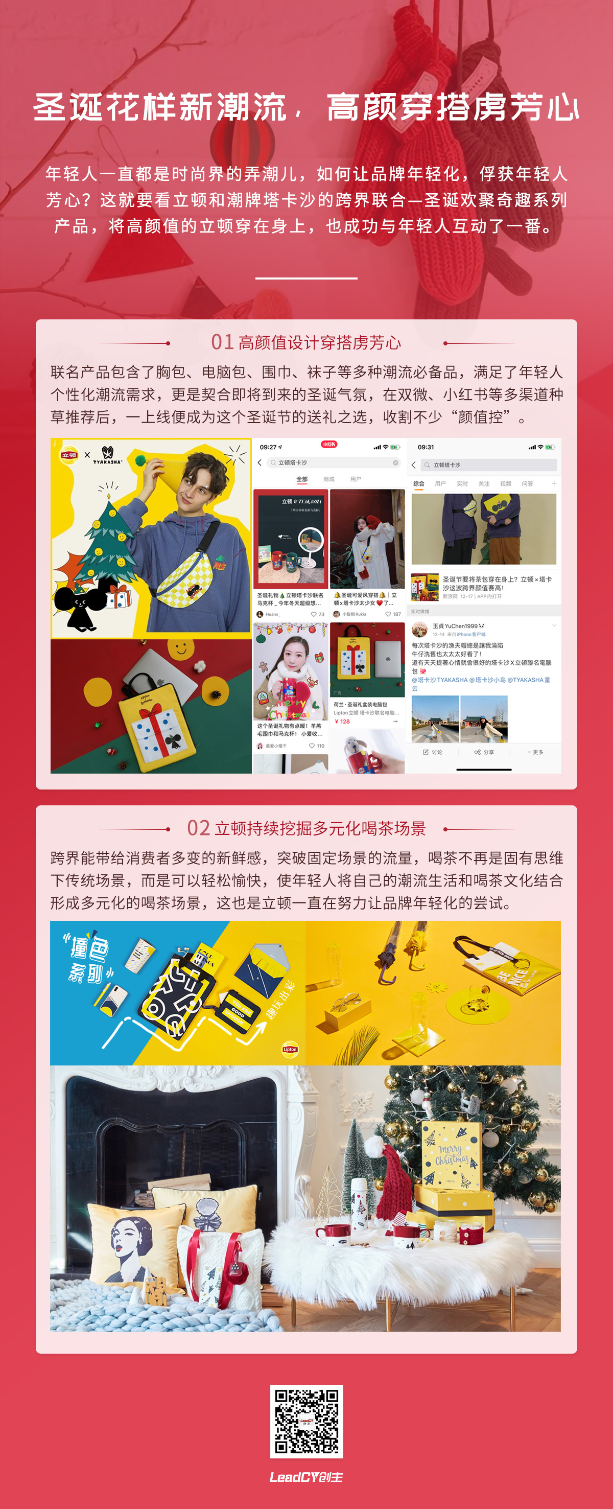 年轻人一直都是时尚界的弄潮儿,如何让品牌年轻化,俘获年轻人芳心?这就要看立顿和潮牌塔卡沙的跨界联合—圣诞欢聚奇趣系列产品,将高颜值的立顿穿在身上,也成功与年轻人互动了一番。